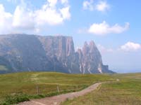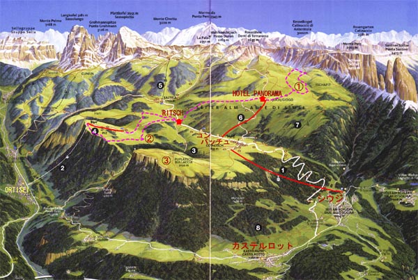 午後は、サッソルンゴが順光となるAの草原を歩く。パノラマホテルからHOTEL RITSCHを経てORTISEIへのケーブル駅を往復する。