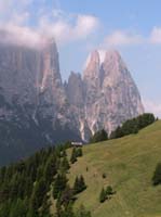ホテル前からのサッソ・ルンゴ。 ガイスラー山塊 Hotel Ritsch Ortisei(高原の断崖の下の町)へのケーブル駅よりの眺望。