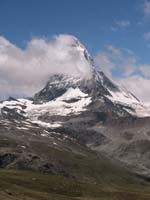 ゴルナーグラート行きの電車に乗り、終点のひとつ手前のローテンボーデンで下車。駅前からは残雪の山々の一大パノラマ。思い入れのあるマッターホルンは盛んに雲をまきあげ全容は見えない。
