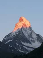 6/30 5:40頃、朝焼けのマッターホルン。神々しいまでに美しい。 |