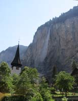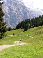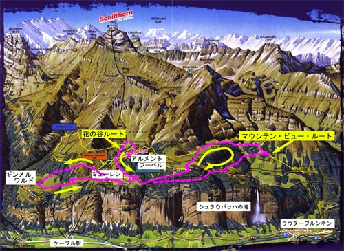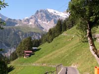 7月はじめ現在、ラウターブルンネンからグリュッチュアルプへのケーブルカーは保守点検中で運転休止中。バスでステッヘルベルク方面に行きケーブルでミューレンに行ける。 |