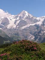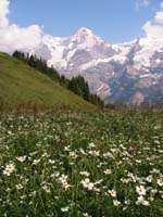 ケーブルカーでAllmentdhubelへ登る(片道7.4chf)。アイガーは横から見る形にはなるものの、ユングフラウ三山は指呼の間。写真では黄色系の花が多いが、眼には赤や紫の花々も多く綺麗。