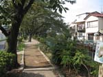 | @ スタート地点:谷塚橋の北20mにある路地が本当の県境。ここを入る。9:30 | A 二つ橋の手前200mにある水門から右斜めに入る。この道が旧毛長川の跡で県境 | 700m程で見沼代用水にぶつかる。ここを左に曲がると毛長川に戻り、川の交差点の水門がある | ここから毛長川の南の遊歩道を行く | 首都高速の下をくぐって・・・ |