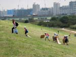 折から、付近の幼稚園児が遠足に来ていて可愛らしい。我々もこの土手に腰掛けて昼食。 |