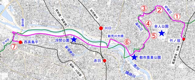 | 都立浮間公園。トイレあり。南側には三田線の浮間船渡駅があるので、疲れたらここから帰路に付くことも可。14:20 | 笹目橋にぶつかる。左へ下りて笹目橋の下をくぐり、新河岸川を行く。15:50 | 次の県境「白子川」の合流点 | 500m先に小さな橋があるのでこれを渡って、白子川まで戻る | 笹目通りと白子川の交差点「三園橋」で今日は終了。16:20 |