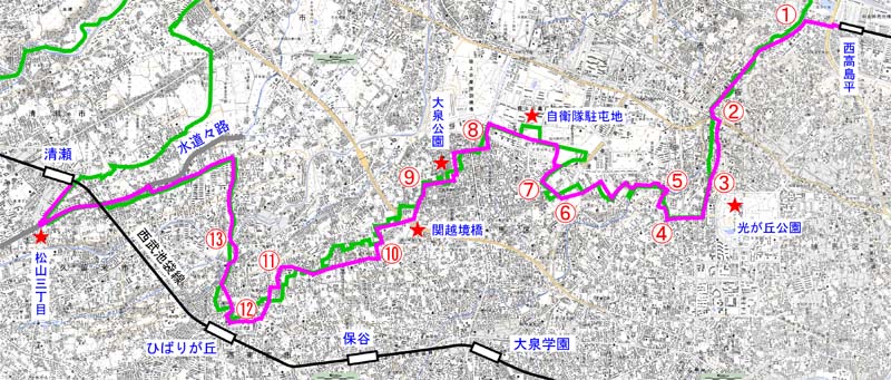 | 陸上自衛隊朝霞駐屯地正門 | G大泉学園高校の西側の変則4差路。真南に入ると・・・・ | ここは水道々路 | 大泉公園11:30着。ここで昼食 | H大泉公園の南側の道(県境)を西へ500m行くと、県境は左に曲がる。 |