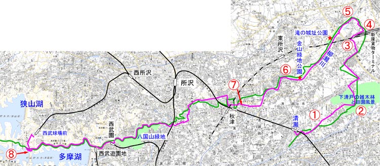 | 今日は好天に恵まれ、富士山が一日中見えた | 対岸は滝の城址公園。ここも良さそう | 柳瀬川の右岸を更に行くと | 11:30 対岸に「金山緑地公園」。一旦橋を渡ってここで昼食 |