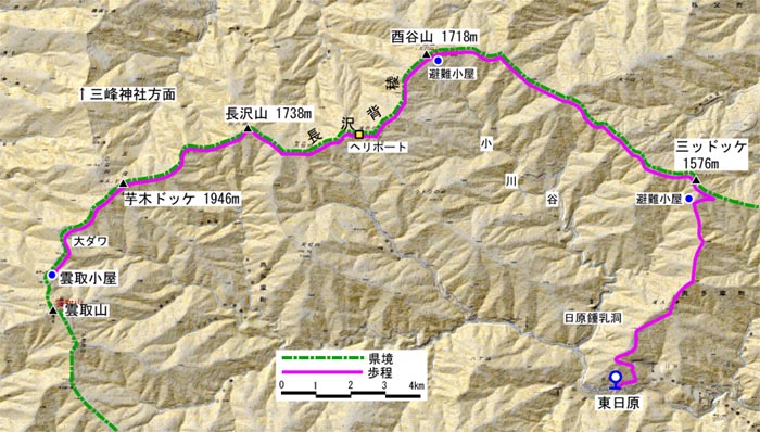昭文社の「山と高原地図」によると、雲取山荘から東日原まで9時間とある。途中、下りる道はない。
