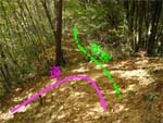 玉川キャンプ場からの林道。キャンプ場受付の入口から左の林道方向に行く。 | 天気は最高、体調は最悪。照葉樹が美しい素晴らしい山道だが、バテバテで100歩歩いては休む状態。 | 死ぬほど歩いて、やっと県境尾根。 県境(緑線)づたいに下まで行けそうだが下部は荒れているとか・・・。赤線は私が来た道。 |