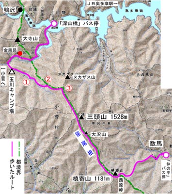 ここからは「笹尾根」で、雲取地域に比べなだらかな尾根歩きとなる。 ・・・とは言うものの、三頭山の登りは標高差約1000メートルと笹尾根の中では最もきつい場所。 JR奥多摩駅 9:15発小菅行きのバスに乗る。火曜日と言うのにバスは中高年で満員状態。 県境は大寺山々頂を通過する。 頂上には仏舎利塔があり、当然そこに至る道もあるらしい。 が、県境上に道が無く、頂上を踏む意味は薄いと考え、バイパスすることにした。 |