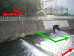 D車庫の北側を右に100mほど行くと県境の細い道に下りる | E県境は川沿いに西へ曲がる。一旦東側の橋まで行って対岸に渡る | F本当は右の尾根が県境だが道が無い。一旦民家の前を抜けて左に迂回 | 右側は分譲住宅だが、尾根沿いに緑道がある |