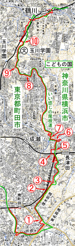 尾根道をたどるルートである。所々に緑地が残り、変化があって面白い。