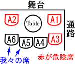 なお、最前列のA1〜A3は美女ではないオカマの攻撃を受けるのでご注意(反対側のB1〜B3も危険エリア)。今回は私の眼の前のA2に座っていた日本人のおじさんがブチュ〜!!とエジキになった。でもこの人は偉い!大きなキスマークをほっぺたに付けたまま帰った。 |