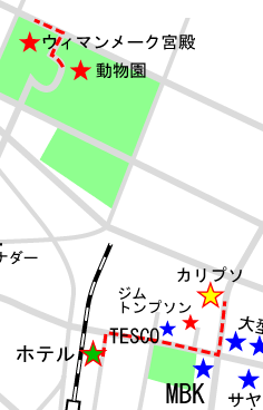 MBKから1km足らず(徒歩20分)。帰りはホテルまで歩く(2km40分)。 |