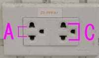 コンセントの形状は日本と同じA型かヨーロッパに多いC型。ホテルなどは殆どがA/C兼用のコンセント(右図)。