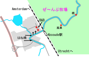 アップカウデ Abcoude: アムステルダム観光のベースに最適 最初からアムステルダム市内には泊まるつもりは無い。 地図を見ると、アムステルダムの南10km程のところにアップカウデと言う小さな町があり、町外れを流れる小川沿いには景色が良いと言う意味の緑線の印がある。”ここだ!”と前から決めて町のホームページにあった2軒のB&Bの住所を調べておいた。 ※2020年:Googlemapで見ると鉄道は地下に潜ったらしく、踏切などは無くっていた。市中にちゃんとしたホテルが何軒が出来たようです。でも田園風景は健在のようで、宿泊地としては今も最適と思います。 ![]() |