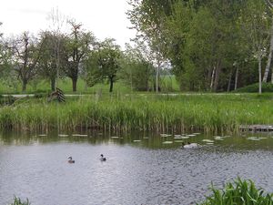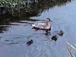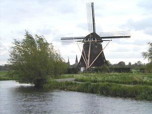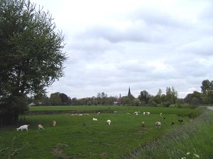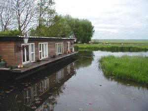 | 旅装を解いてから小川を歩いてみる。宿のおかみさんによると約1.5km先に橋があるので、そこまでの往復なら約1時間との事。 川の両側には牧草地が広がり、羊が草を食んでいる。我々が歩いていると羊達がいっせいにこちらを見る。 あの ニ〜ッと笑ったような顔でまじまじと見つめられるとこちらも思わず照れてしまう。 牧場の柵に沿って幅1mくらいの溝があって、小鴨達が母親の後を泳いでいる。でも中には道草ばかり食って、はっと気が付いては死に物狂いで追いついているやんちゃ坊主も・・・。 子羊はいつも好奇心旺盛で母親から離れては鴨と戯れている。途中、風車があり蛇行した川ごしに見る風景は、まさに絵葉書もの。 我々は夕方歩いたが、岸辺には草花が咲き乱れ、昼間だったらもっと良かっただろう。 但し、さすがにアムステルダムに近いせいで、地平線のあたりには団地らしい建物が遠目に見えるのが玉に瑕。 アップカウデ駅はアムステルダムとユトレヒトを結ぶ幹線にあり(ICは停まらないが)、アムステルダム中央駅まで電車の本数も多く(1時間に3-4本)、22分で着く(片道4.4euro、ラッシュアワー以外なら2.6euro)。美術館エリアへの12番トラムに便利なAmstel駅までなら、わずか13分=3.1/1.86euro。 あのゴミゴミした市内の高いホテルに泊まるなら、ここに泊まって電車で通った方がはるかに良いのに。 オランダ国鉄のホームページ(ここで時刻、運賃が分かる)