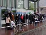 Maid」それにゴッホの自画像などが有名。その他にも有名な絵がいっぱい。またデルフト焼きやドールハウス、ロココ調の家具などの逸品が目白押し。お宝鑑定団に出したら「いい仕事をしているね〜」と言うに違いない。 さすがに観光客が多く、夜警は背伸びしても見えないほど。 美術館を出てから「アンネの家」まで歩く。ところが入口からビルを一回りするほどの長蛇の列で待ち時間は1時間以上(それも雨のなかを)。 *アンネの家は人気が高い上に、狭く、いつも混んでいて行列だそうだ。 諦めて、ダム広場からムント広場を抜けて帰路につく。途中運河のほとりに花屋が集まる場所があるが、花ばかりではなく、みやげ物も置いてあり市内の他の店よりかなり安い。 木靴の形をしたマグネットが他の店では2.7euroだったのに、ここでは3個で5euroから小さめなら5個で5euroであった。