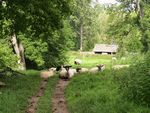水車小屋の脇からさらにフットパスは続く。放牧地と森のフットパスを20分ほど歩くとアッパー・スローター村に着く。