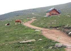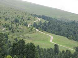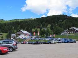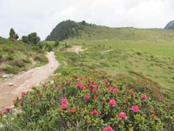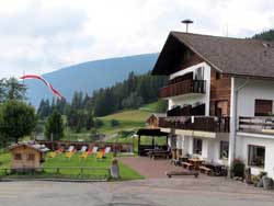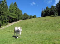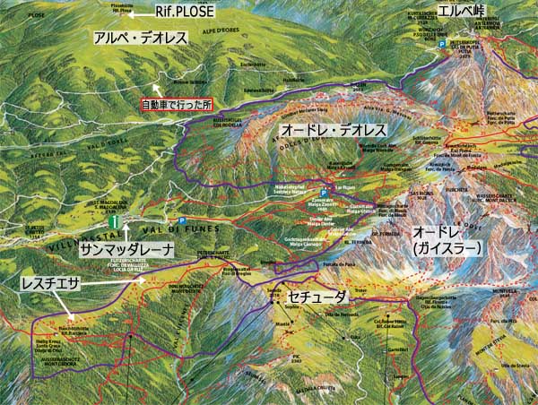 道標や山頂の小屋は「プローゼPLOSE」。プローゼはブレッサノーネよりさらに西の方の山と思っていたが、良くわからない。 プローゼのホームページ ![]() 場所はフネス谷の1本北の谷(Val D'Eores)の北側の山。 対向車が来ると退避スペースまでバックさせられるような山道(舗装はされている)を約1時間。 しかし、リフトは運転しておらず(冬季のみかも)、下の写真を撮って引き返す。