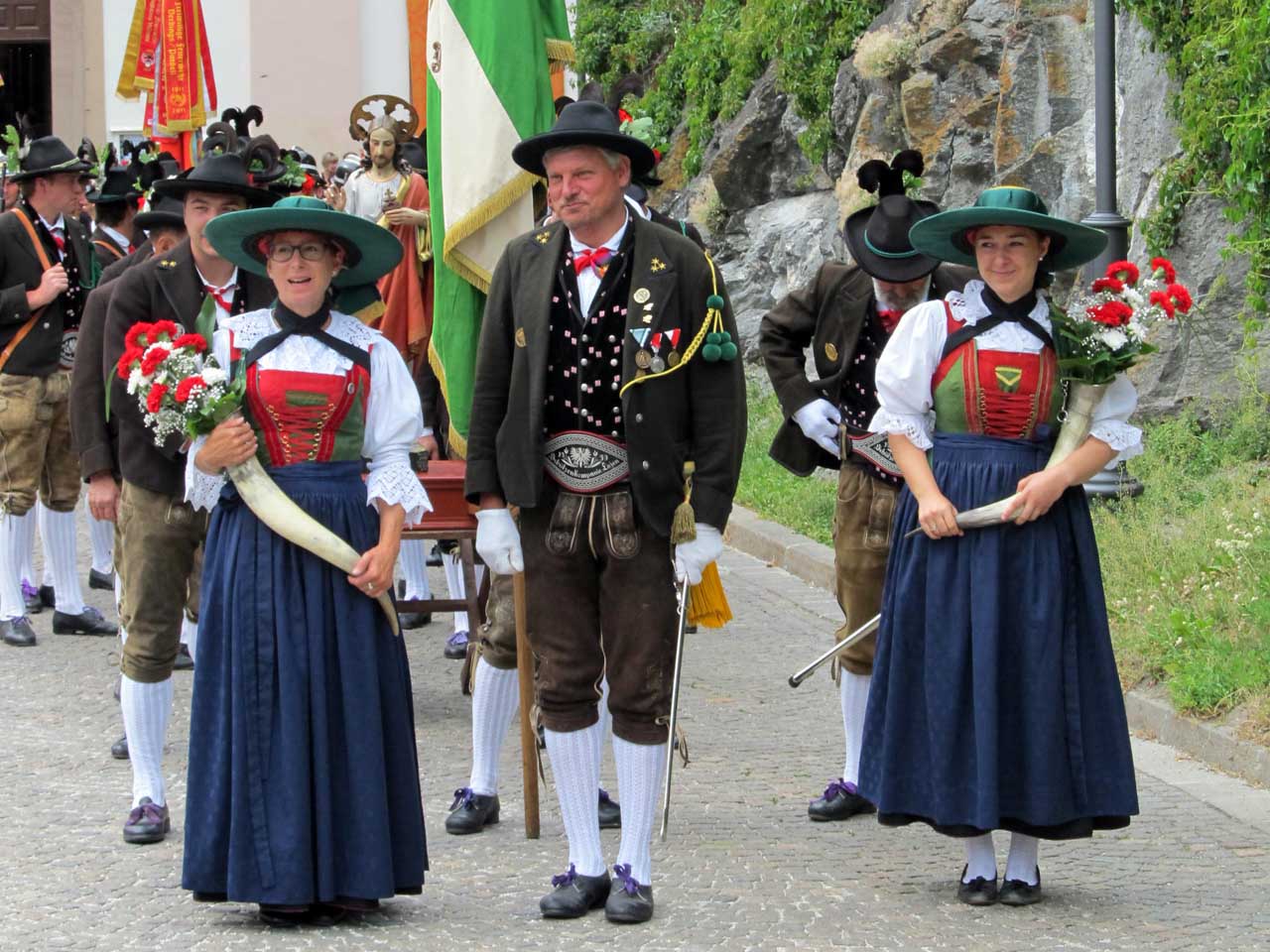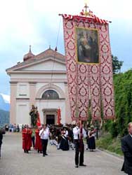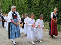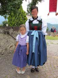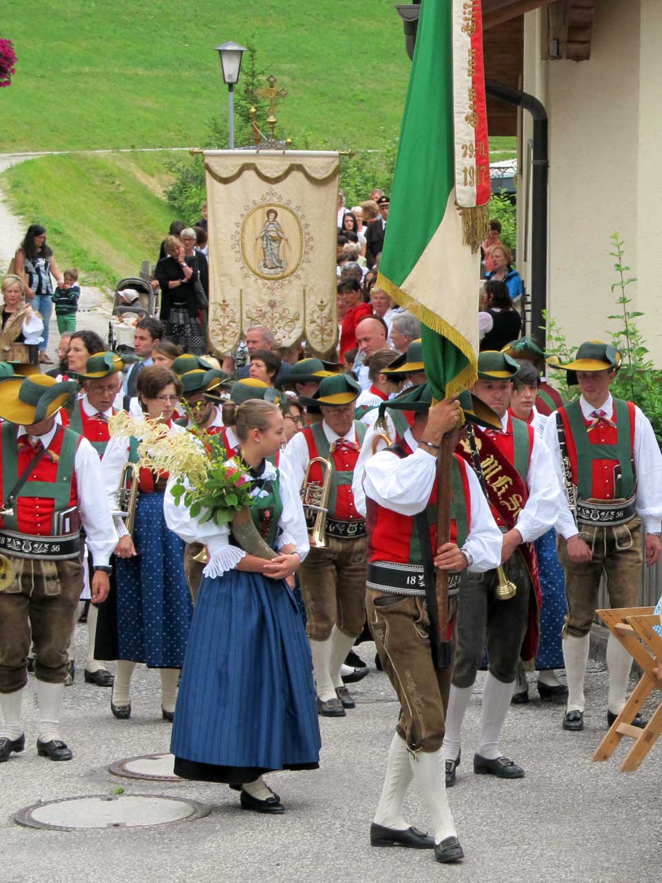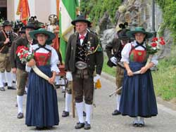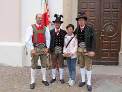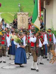 どう見ても聖体節まんまだが、聖体節は先週の日曜のはず・・・??。 (実は後日分かったことなのだが、聖体節の大事なイベントに「チロル版大文字焼き」がある。先週は雨で大文字焼きが出来ないので1週間延期になったらしい。 *大文字焼き:何でもナポレオン軍が攻めてきたときにチロル軍は周囲の山でかがり火を焚いて大軍がいると見せかけてナポレオン軍を撃退したとの・・との故事にならうものらしい(火牛の計として古来中国や日本でも同じような話は沢山あるが・・)。チロルではハートと十字架を組合わせた形に火を焚く。