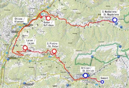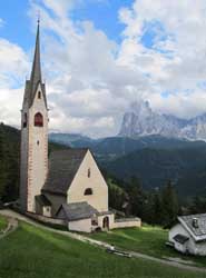 宿に到着後、歩いて10分の所にある「聖ヤコブ教会」から6番のコースをオルティセイまで歩いてみる。 ここもドロミテのパンフレットの定番スポットである。