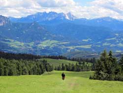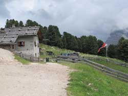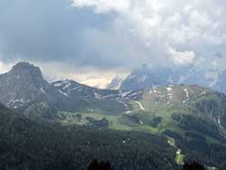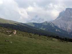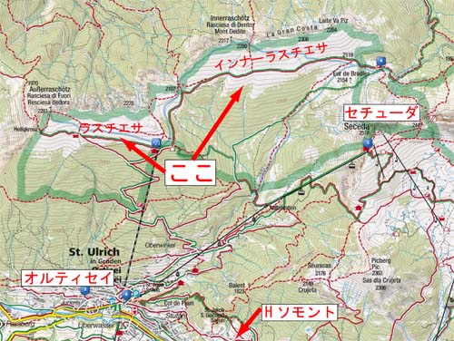 距離的にはガルデナ峠を越えるルートが一番近いが、天下の難所ポルドイ峠を抜け、その南側にある草原Gardeciaを歩く予定。 ポルドイ峠の駐車場からだと1時間以上かかるので、リフトのあるポルドイホテルあたりに車を停めるつもりであったが、駐車場が無く、あきらめる。 ←歩いてみたかった草原