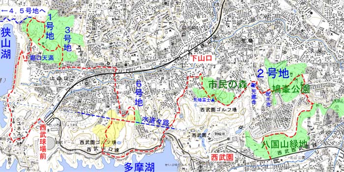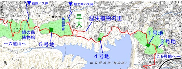 緑の森博物館から六道山公園、野山北公園へのコースは「狭山丘陵」をご覧ください。