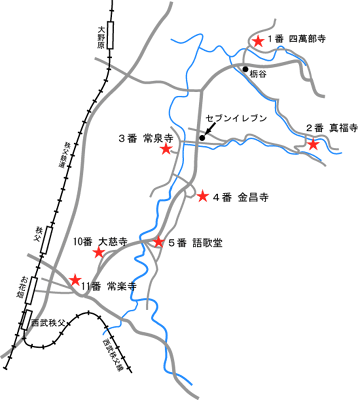 11番 常楽寺: もはや市街地だが、小高い山の斜面にあり、景色は良い。 駅に付いたら丁度10分後に特急が出る。 しかし禁煙席は満席なので仕方なく喫煙席にする。 社内に入るとタバコの煙が充満していてくさい。 自分もタバコを吸うのに、他人のタバコはくさい・・・なんと身勝手な男だ。 一駅で「横瀬」。ここを過ぎれば後は飯能まで停まらないので、禁煙席の空席を探す。 結構、空いている・・・さっきの満席は何だ? しかし、禁煙席では中年グループが酒盛りで盛り上がっていて、「さきいか」の臭いが充満している。 う〜ん、「たばこ」か「さきいか」かを悩んだ末、「さきいか」を選ぶ。 今朝は早くから行動開始したせいか、これだけ歩いたのに自宅最寄駅には5時半に付いた。 |