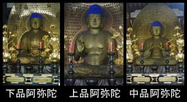 本堂に相対して3つの阿弥陀堂(上品、中品、下品 品はボンと読む)がある。各々の阿弥陀堂には更に3体の阿弥陀像(上世、中世、下世)があるので合計9体となり九品仏と言われる。人も少なく良いお寺さんであった。