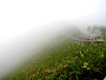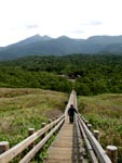 知床峠: 知床半島を横断する唯一の自動車道路。下は小雨模様だったが高度を上げて行くにしたがって雲の上に出て快晴。 峠には展望台がある。説明版によると正面に国後島が見えるとあるが、下は雲海で見えない。でも目を凝らすと雲にしては一寸おかしな黒い線が雲の上に見える。ひょっとしたら、これが国後の山々の頂上部かもしれない・・いや、そう言うことにしておこう。 ウトロ方面に山を下りて行く。北側は晴れ。海にぶつかって右へ10分ほどのところに「知床五湖」。ここからさらに北に行くと滝壷が温泉になっているカムイワッカの滝があるが、夏季は自動車乗り入れ禁止。 知床五湖: 1から5湖まであるが、3〜5湖はヒグマ出没中で立入禁止!。 1,2湖を歩く。各湖は知床連山を水面に映し秘境っぽい。 地元ボランティアの話によると、ここらは年中風が強く水面が波立ち、今日のように鏡のように連山を映すことは奇跡的・・・とのこと。 リップサービス半分だろうが、いままで天候に恵まれなかったので素直に喜ぼう。