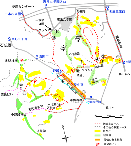 | J旧小野路宿 | K街道筋の旧家 | L裏鎌倉街道 | M一本杉公園 | |