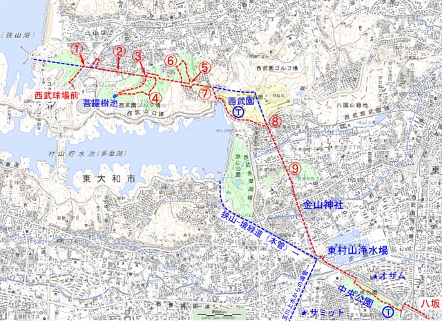 Eから尾根を登り、再び水道道路に戻る(ゴルフ場の柵まで)。もう一度トトロの森6号を通ってFを通って進むと西武園に至る 水道は西武園の中を通過する。中は省略して迂回する。途中レストラン「モンベル」があり、トイレ借用可 西武園の東門付近から水道道路が再び姿を見せる