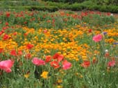 ハナビシソウはカリフォルニア原産のケシ科の多年草。オレンジ色が多いが、花畑には白、ピンクなどもある。