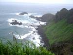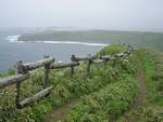 朝9時発の定期シャトルバス*で最北端のスコトン岬へ〜(約50分 \1,180/人) *シャトルバス(1便/日)は金田岬をショートカットし、植物園を経由する。 スコトン岬にはトイレと土産物屋。沖合いにトド島がある。冬場ならトドが見れるとのこと。最北端と言うだけで、取り立てて見るべきものは無い。ここから舗装道路を歩いてトド島展望台を経て、1時間でゴロタ山への登山口に着く。天候が不安定で空が明るくなって雨が止んだかと思うと、5分と経たない内に横殴りの雨が吹きつけ目も開けられないほど。 今日はこれでウォーキングをやめ、近くの江戸屋港からバスに乗るか、ゴロタ山へ登るか悩んだが、ここまで来てメインイベントのゴロタ山のお花畑を見ないわけには行かない。 ←海から吹き付ける雨に凍えながら歩く・・・・ |