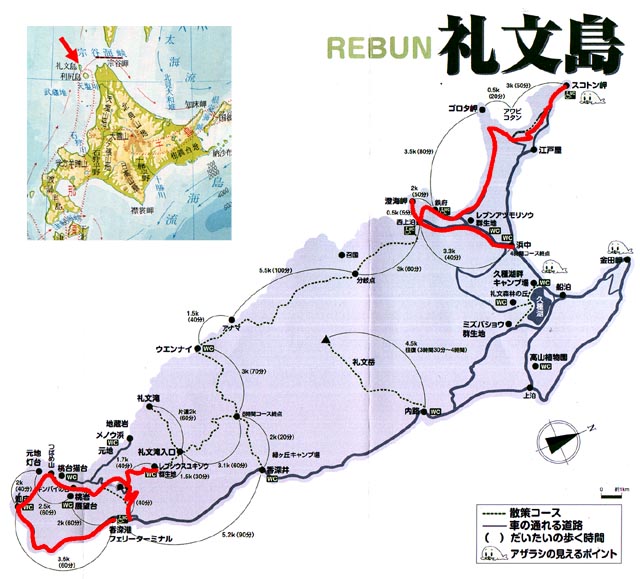 | 以前より利尻・礼文に行きたかった。 調べてみると、利尻島は利尻岳登山以外にはあまり見所は無いらしい。 勿論、日本百名山の利尻岳に登ってみたいが結構ハードで物見遊山気分では登れそうにも無い。 一方、礼文島は別名"花の浮島"と呼ばれるほどで、山頂から海岸まで草原と高山系の花々に覆われハイキングコースも多数あるらしい。礼文から見る利尻岳も素晴らしいらしい・・・と言うことで礼文島に決定。 |