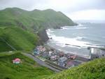 西上泊から浜中バス停まで自動車道を歩く(約50分)。 舗装道路なので歩きやすそうだが、返って体にこたえた。 浜中には店はおろか自販機さえない。でもバスは1時間以上先。 バス停の小屋の中でジッとバスを待った。浜中〜香深 \1,020 |