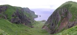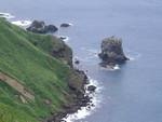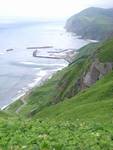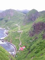 一旦、自動車道路に戻り、ここから桃岩を通って最南端の知床港まで約4時間のコースを歩く。 桃岩の展望台は駐車場からも近く観光バスで来た団体さんで賑やか。ここから見える猫岩と呼ばれるトトロみたいな形の岩が名物。断崖絶壁なのに草で覆われていると言う日本では見慣れない風景。 ![]() ↑桃岩から北方 右の集落は香深。左は元地港 ![]() ↑桃岩から南西方向。 猫岩が見える |