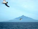 ←沖合いまでかもめがフェリーを追いかける。フェリーの乗客が差し出すパンを手から器用に受け取る。 |