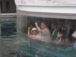 宿屋に行って預けた荷物を受け取り、15:40のフェリーで稚内港へ。 恒例の桃岩荘YH*1の見送りパフォーマンスがすさまじい。 *1 桃岩荘YH: 北海道3大おばかYHを自認している。ここに泊まる場合は理性と羞恥心をかなぐり捨てることが条件。その代わり普段のストレスは霧散し生まれ変わって帰宅できるとのこと。 宿泊中に洗脳された乗船客も日の丸扇をハチマキに挿しこんで両手を頭の上で叩きながらパフォーマンスに応えている。 |