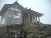戻り道で岩にしがみつきながら天狗岳の祠を写真に収めた(頂上に休む平地は無い)。