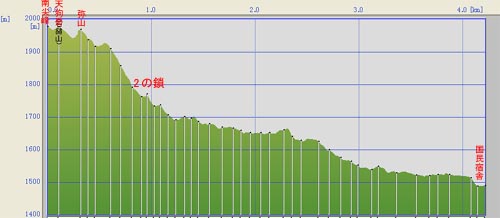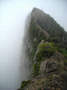 主峰は東50mにある天狗岳1982mだが、尾根はやせており、断崖絶壁を見下ろしながら鎖に体重を掛けて下りなければならない。