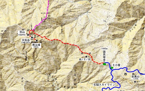 やがて北方の石鎚神社成就社から来る登山道と二の鎖で交わる。