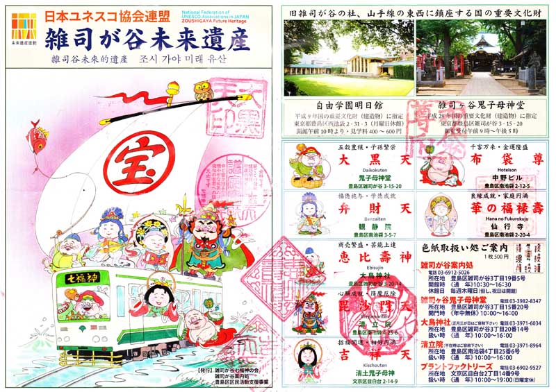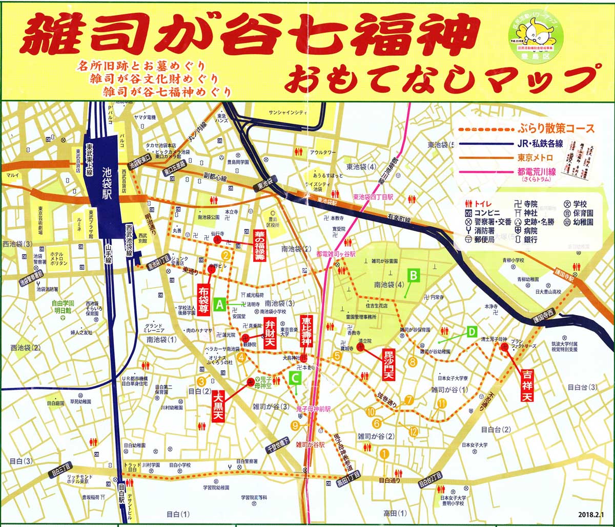 2018年4月8日 花まつりに護国寺を訪ねたが、途中の神社に「雑司ヶ谷七福神」の旗を見つけ、 どうせなら・・・と七福神コースを辿って帰路に着いた。 手抜きで申し訳ありませんが、ご朱印帳代わりにスタンプを押した地図のみをアップします。 ぶらぶらある記 目次へ