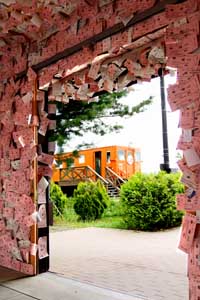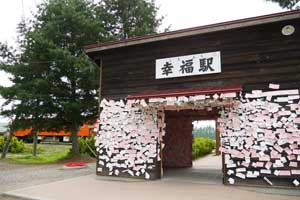 「愛国→幸福」の切符をかたどった絵馬がわりの札が駅舎の内と言わず外側までびっしりと貼ってある(ちなみに「愛国駅」は15km北)。 皆さんお幸せに・・・