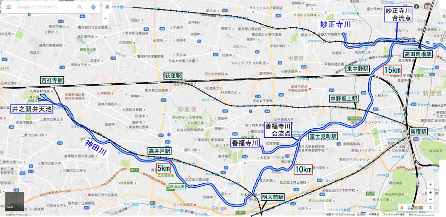 多摩川の砧で取水した水を中野方面に導く水道道路 | 善福寺川からも地下調整池に取水している |
