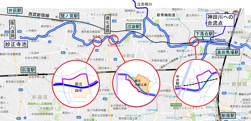 | 妙正寺池 10:30 | 鷺ノ宮駅 11:00 | 若宮町付近。まだ水量は少ない | 環七横断 11:30 |
