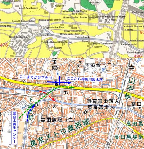 | 妙正寺川は下落合の辰巳橋付近で神田川の分水路に合流し終わる。 ここから先は神田川となる。 しかしながら終戦直後の古い地図を見ると、妙正寺川は南に曲がって神田川に合流していたらしい(下側地図の赤い破線)。事実この部分は今も道になっていて最後は東京都管轄の三角地で金網で仕切られて入れない。 この三角地を川側から見ると不自然な窪みがあり、ここが昔の合流点ではないかと思われる。 なお、更にアラを探すと、神田川の水は水位が上がった時しか分水路には流れない。水が一番沢山流れているのに名前は神田川に変わるのは妙正寺川がかわいそう。 なお、分水路には近くにある「水再生センター」で処理され綺麗になった一帯の下水も常時分水路に放流されているように見える。 |