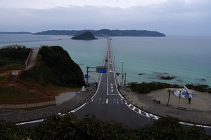 沖にある角島へ真っ直ぐな橋が伸びているこの風景がインスタグラムに投稿されて一躍脚光を浴びることになった。 今日は台風の影響で朝から激しい雨。角島の手前で雨が止み、出発するとまた降り出した。 |