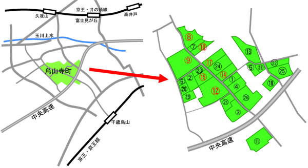 久我山駅、烏山駅どちらからも1km程度で散歩にちょうど良い距離。